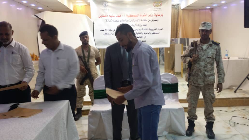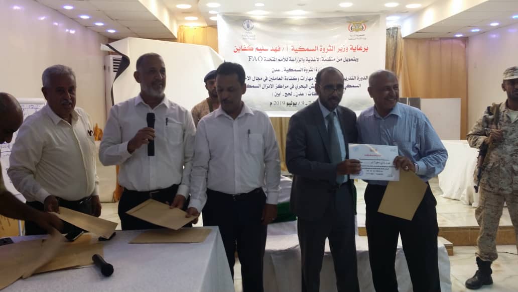 مجال الإحصاء السمكي والرقابة والتفتيش البحري في مراكز الإنزال السمكي كانت موضوعا لدورة تدريبية الخاصة هدفت الى رفع مهارات وكفاءة العاملين في مهارات تطوير وتحديد عملية الإحصاء السمكي والرقابة والتفتيش البحري.، محافظات ( عدن- لحج- أبين ) والتي تنظمها وزارة الثروة السمكية وبتمويل من منظمة الأغذية والزراعة للأمم المتحدة FAO .