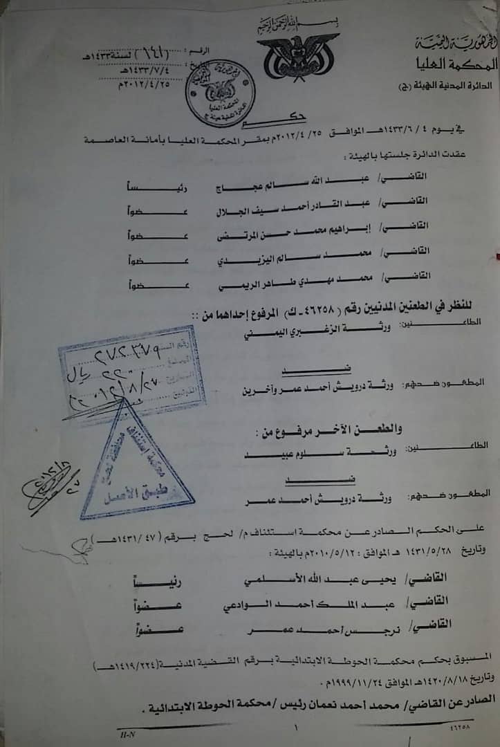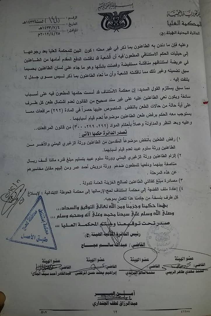 2012/4/25 م بصدور حكم محكمة عليا مؤيد للحكميين الابتدائي والاستئنافي.