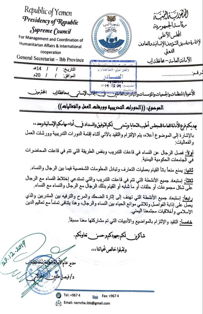 وأكدت وثيقة صادرة من مسؤول هيئة الشؤون الانسانية بمحافظة إب، التي أنشأتها المليشيا، بضرورة استبعاد جميع الانشطة التي تهدف الى اثارة الضحك والمرح والترفيه بين المتدربين بحجة أنه يؤدي إلى اذابة الفواصل بين النساء والرجال.