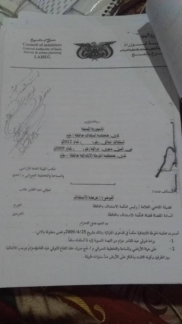 وكان مدير عام فرع الهيئة العامه للارضي في لحج، مذكرة بتاريخ 4 يناير 2019 لرئيس الهيئة العامة للأراضي لاصدار توجيه منه باستكمال الاجراءات وتمكين المدعي من الأرض، بدعوى استكمال كافة إجراءاته وصدور أحكام قضائية، فيما القضية مازالت منظورة امام الاستئناف.