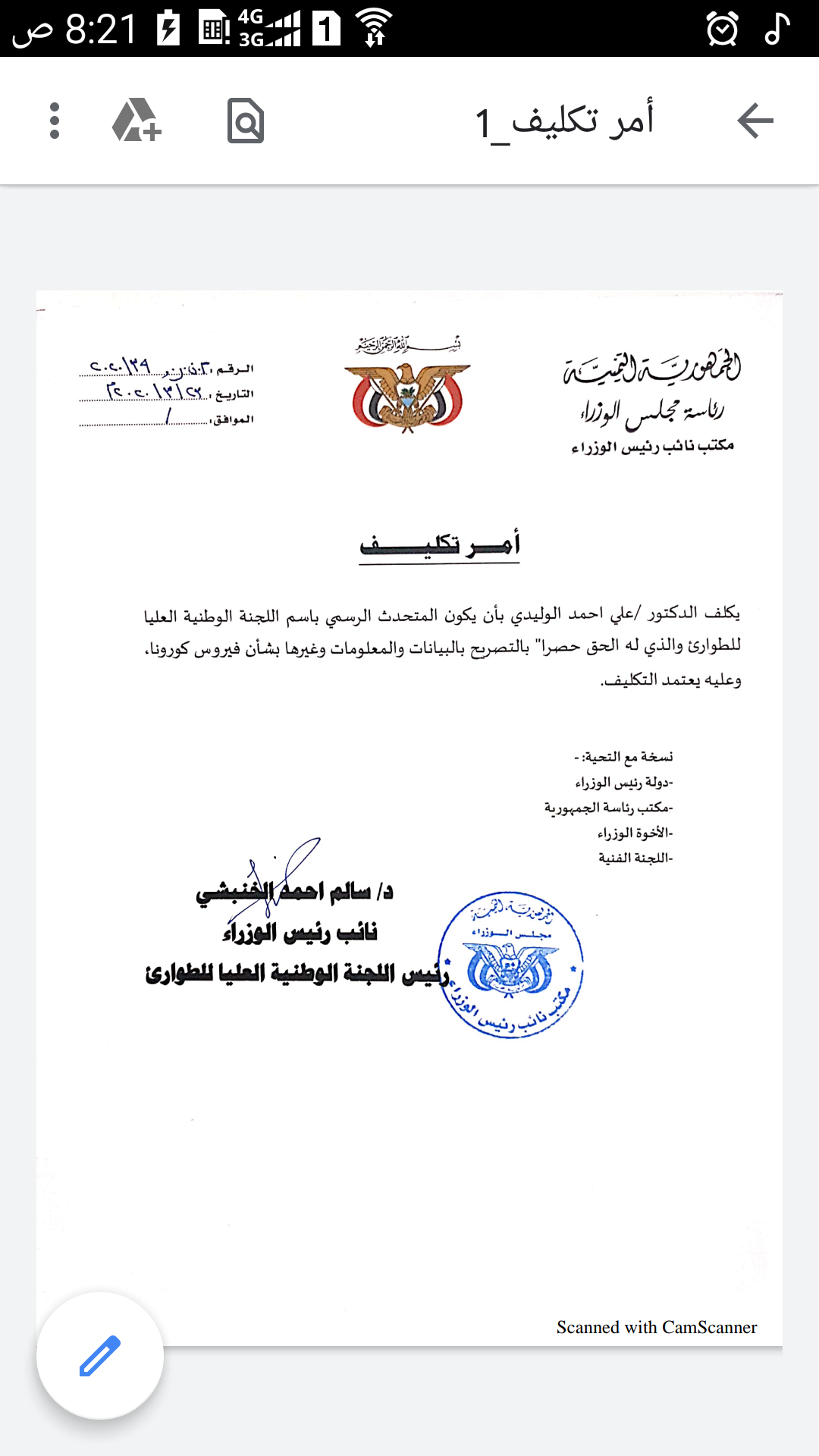 أصدر نائب رئيس الوزراء رئيس اللجنة الوطنية العليا للطوارئ الدكتور سالم أحمد الخنبشي أمر تكليف الدكتور علي أحمد الوليدي كمتحدث رسمي باسم اللجنة الوطنية العليا للطوارئ .