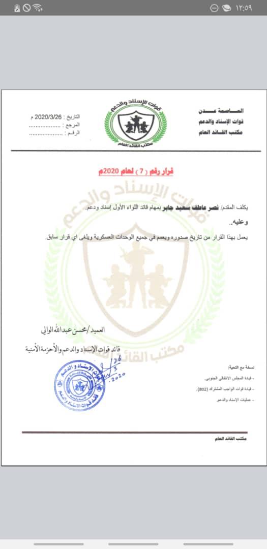 أصدر المكتب العام لقوات الدعم والإسناد القرار رقم 7 لعام 2020 م وهو تكليف المقدم نصر عاطف سعيد جابر الملقب *المشوشي* رفيق الشهيد ابو اليمامة بمهام قائد اللواء اول دعم واسناد .