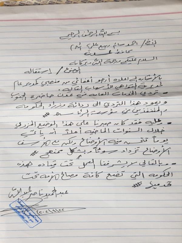 – وبالتالي لا يشرفنا العمل تحت قيادة هذه الحكومة التي تضع كافة مصالح الامة تحت قدميها #