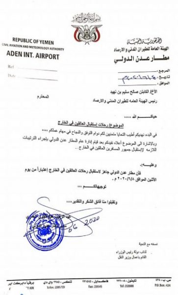 أعلن مدير عام مطار عدن الدولي الاستاذ عبدالرقيب العمري عن استعداد المطار وجاهزيته في استقبال رحلات العالقين من الخارج والذي تم ايقاف رحلاتهم بسبب انتشار فايروس كورونا في معظم دول العالم.